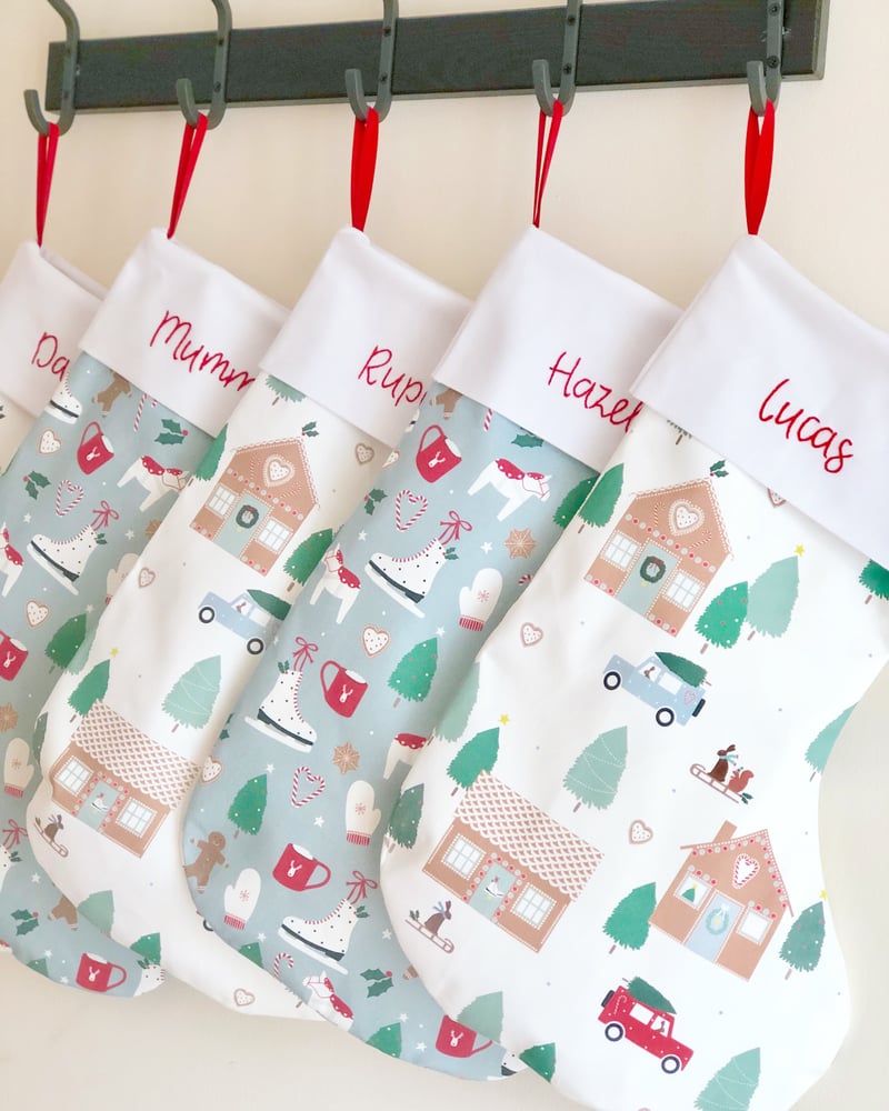 Every stocking is handmade just for you by me with lovely cotton panama which has been printed using eco-friendly inks in the UK. Stockings are lined and include a red hanging ribbon. Stockings measure 48cm top to bottom and 29cm heel to toe. Please write your chosen name for personalisation in your order notes at checkout.