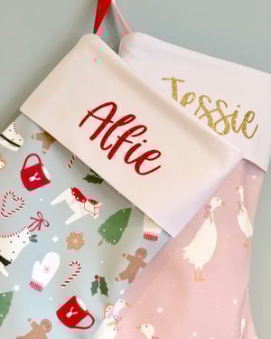 Every stocking is handmade just for you by me with lovely cotton panama which has been printed using eco-friendly inks in the UK. Stockings are lined and include a red hanging ribbon. Stockings measure 48cm top to bottom and 29cm heel to toe. Please write your chosen name for personalisation in your order notes at checkout.